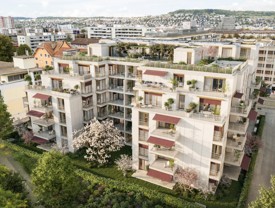 Zwischen Albisriederplatz, Stadion Letzigrund, dem Freibad von Max Frisch, den Grünanlagen des Heiligfeldparks und des Stadtfriedhof Sihlfeld entstehen in diesem dynamischen Umfeld 89 Mietwohnungen.