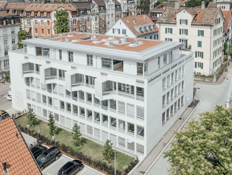Von 2020 bis 2021 wurde die Liegenschaft umfassend saniert und mit einem Holzbau von Blumer-Lehmann aufgestockt. Mit sorgfältiger Planung und Durchführung sind sechs helle Wohnungen und grosszügige Büroflächen entstanden.